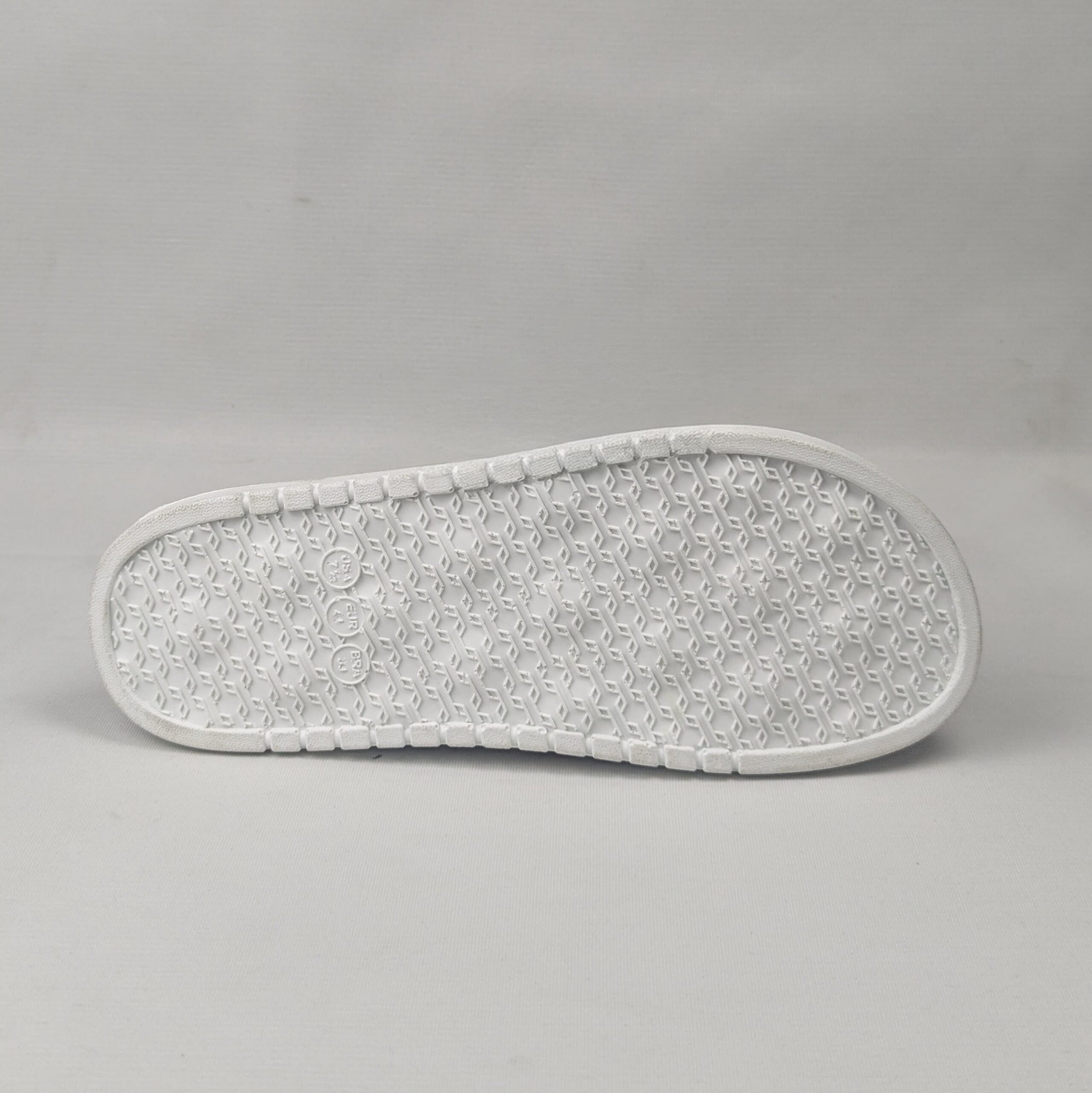 White: Black footbed, white sole, and a white strap with black monogram print and black buckle/accents.